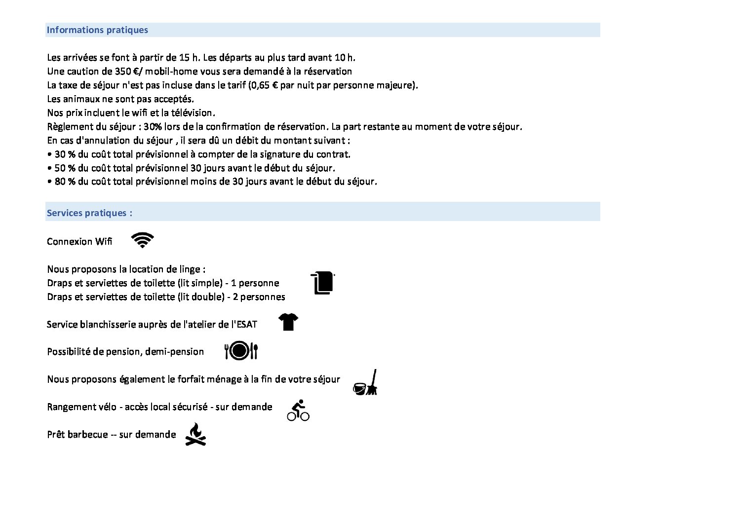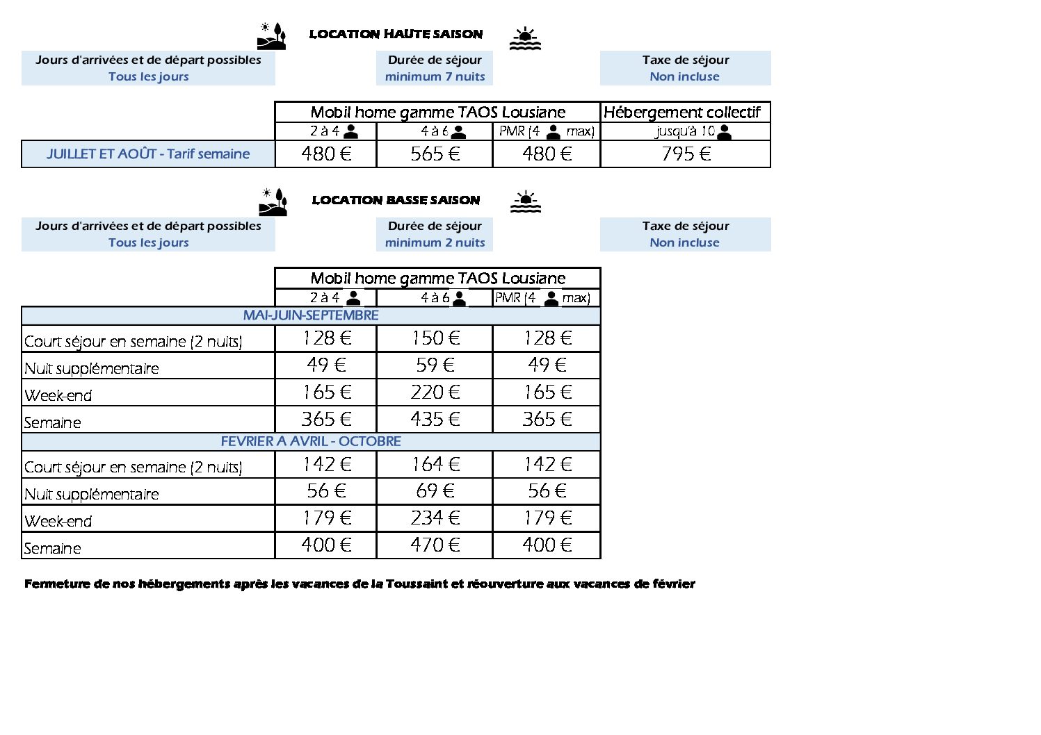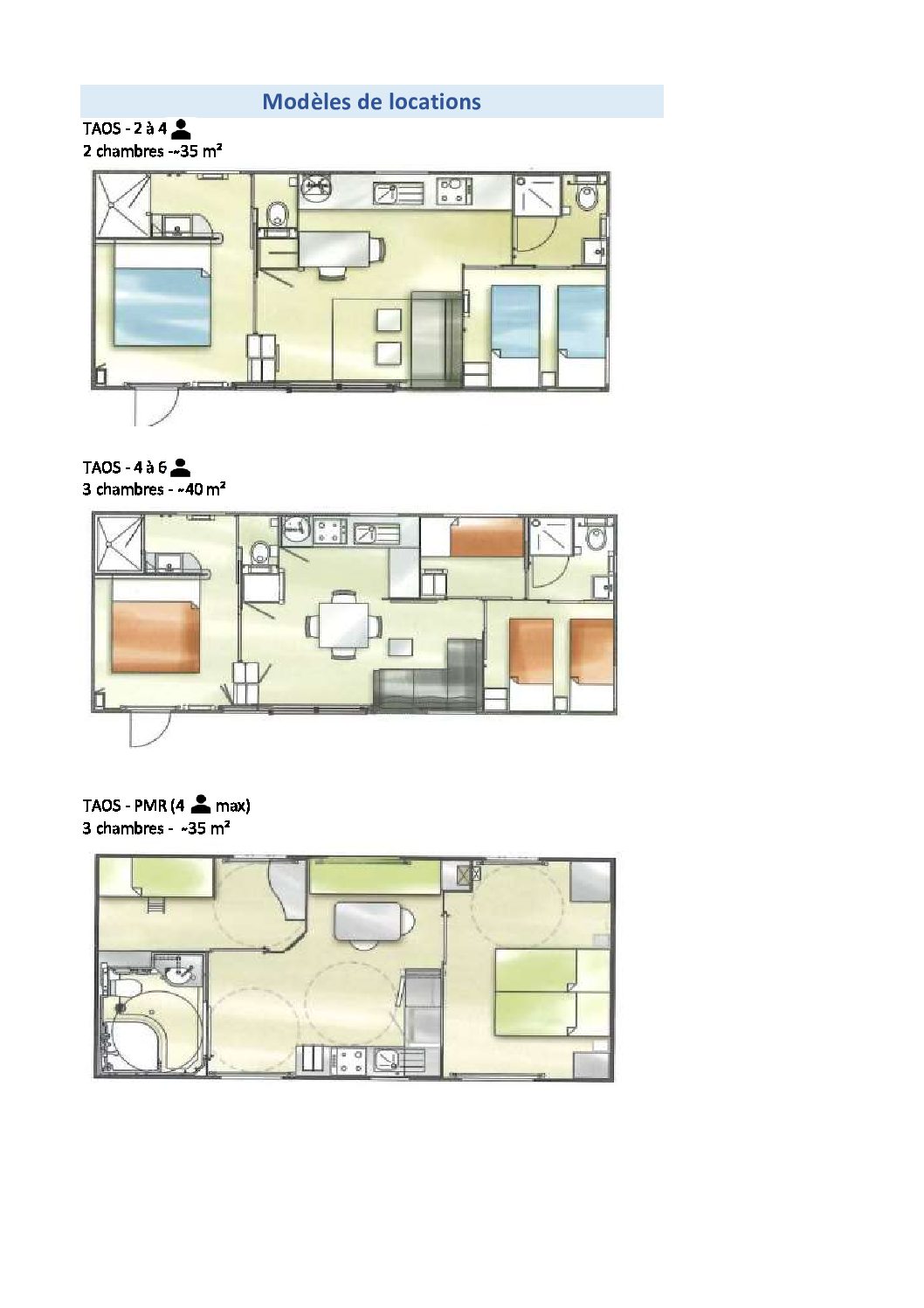Pour vous accueillir, de février à octobre, lors de vos séjours personnels ou professionnels, nous disposons de 4 mobil-homes de 4 à 6 personnes composés de 2 à 3 chambres, d’un espace cuisine-salon et d’une terrasse.